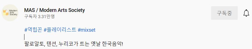 유튜브 알고리즘을 통해서 알게 된 역힙꼰의 플레이 리스트(이하 플리)를 소개합니다. 실제 채널 이름은 MAS / Modern Arts Society입니다. 래퍼로 알려져 있는 팔로알토와 허클베리피, 그리고 누리코가 MAS 채널을 담당하고 있습니다. 해당 채널의 정보에 대해 자세히 알고 싶다면 유튜브 MAS 채널에 정보란을 찾아보시면 도움이 됩니다.